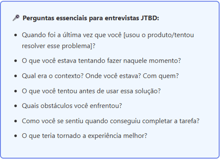 Jobs to be Done: identificar a tarefa que o usuário quer completar (verbo + objeto + contexto) e validar com entrevistas e dados de comportamento real.