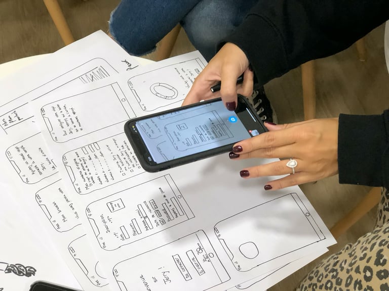 A cada toque em um botão representado no papel, alguém do time de UX precisa ir trocando as telas para criar essa experiência de progressão de interação. Essa é uma técnica bastante comum para validar ideias e testar a experiência de usuário.